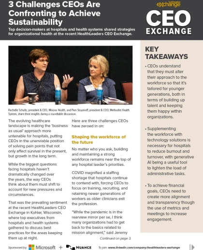 That was the prevailing sentiment at the recent HealthLeaders CEO Exchange in Kohler, Wisconsin, where top executives from hospitals and health systems gathered to discuss best practices for the areas keeping them up at night. Download the report and read about their conversation.